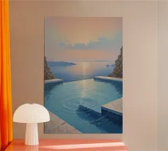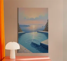 Questo surreale dipinto a olio mostra una piscina a sfioro che cattura il riflesso di un tramonto mozzafiato. I toni vibranti ma morbidi del cielo si riflettono nell'acqua cristallina della piscina, creando una scena coesa e pacifica. Il paesaggio circostante è caratterizzato da isole lontane immerse nel dolce chiarore della sera, che aggiungono profondità e serenità alla composizione. Le morbide increspature e le texture precise della piscina elevano il dipinto a capolavoro tranquillo, celebrando l'unità tra natura ed espressione artistica.