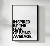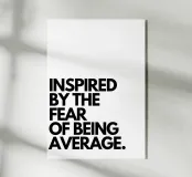 "La frase "INSPIRED BY THE FEAR OF BEING AVERAGE!", impilata su più righe e resa con un carattere sans-serif nero in grassetto su uno sfondo bianco pieno, trasmette un messaggio di ambizione e di spinta a eccellere",