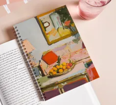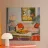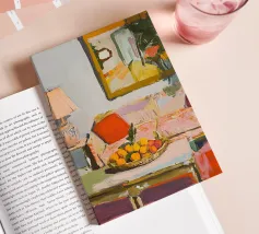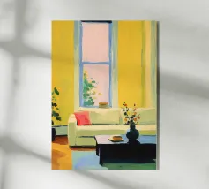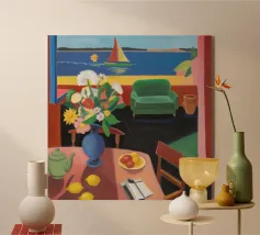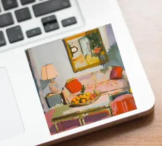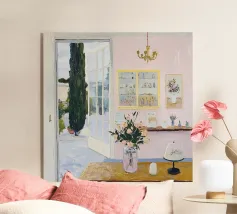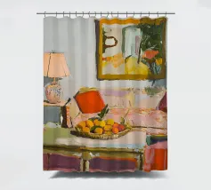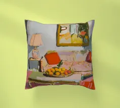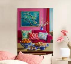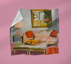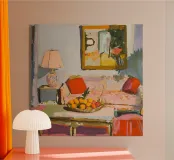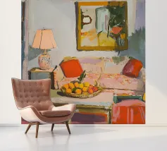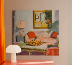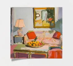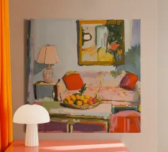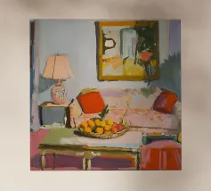 Dipinto di una scena d'interni con accenti rosa e arancioni, su cui si trova un divano rivestito in tessuto grigio chiaro e decorato con cuscini rossi. Accanto al divano si trova un tavolo con vari frutti. La stanza contiene anche una lampada su un lato e un tavolino al centro tra due sedie. Davanti ad esso è appesa una grande cornice e un piccolo specchio riflette parte del suo contenuto.