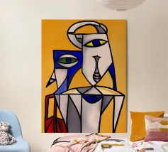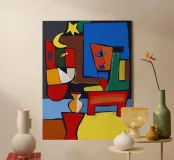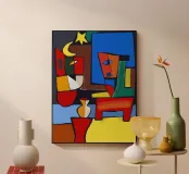 Colori vivaci e forme astratte si uniscono per formare quella che sembra la rappresentazione frammentata di una scena, forse una stanza con degli oggetti. Le linee decise e le tonalità contrastanti conferiscono all'opera un'atmosfera dinamica e moderna.