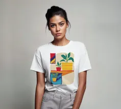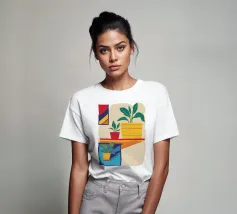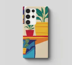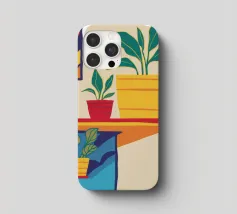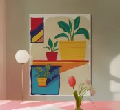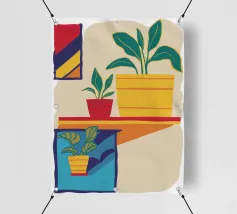 Una scena d'interni minimalista con piante d'appartamento su uno scaffale giallo su uno sfondo neutro. La composizione è pulita, moderna e serena e celebra la bellezza della vita semplice e delle piante da appartamento.