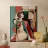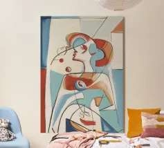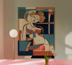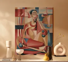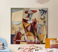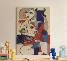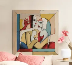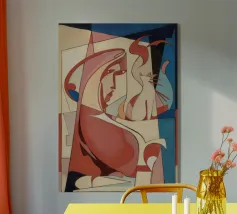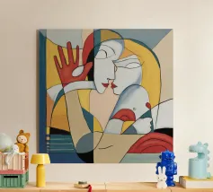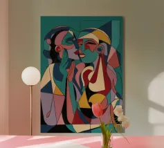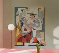 Questo dipinto presenta due figure astratte in una posa intima e ravvicinata. L'uso di forme geometriche e di colori decisi aggiunge profondità e complessità alla scena.