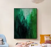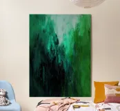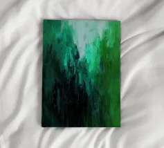 A layered abstract painting dominated by deep greens and cool turquoise tones, built through expressive vertical brushstrokes. The textured surface and shifting depths evoke a sense of immersion, growth, and quiet intensity. This artwork suggests a passage inward — into nature, emotion, or stillness — making it a powerful yet calming statement for contemporary interiors.