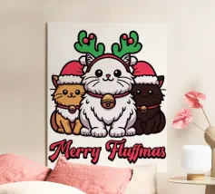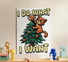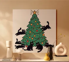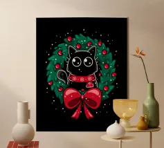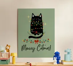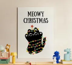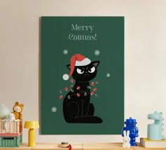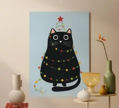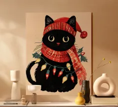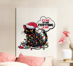 Un gatto nero che indossa un cappello da Babbo Natale è spiritosamente impigliato in luci natalizie colorate. Il testo accanto al gatto recita: "È abbastanza allegro?".