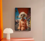 Isabelle, la barboncina dal pelo bianco, passeggia elegantemente per le strade di Palm Springs, indossando un superbo completo arancione. Con i suoi occhiali da sole dorati e il suo atteggiamento sicuro, incarna lo spirito della controcultura della Beat Generation che ha segnato la città, combinando uno stile di vita eccentrico con il senso della moda.