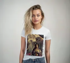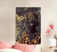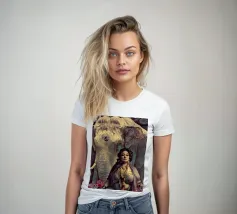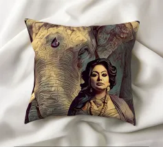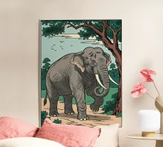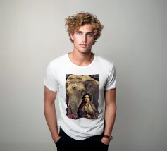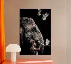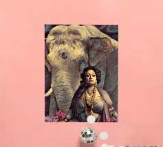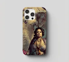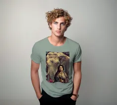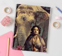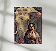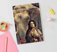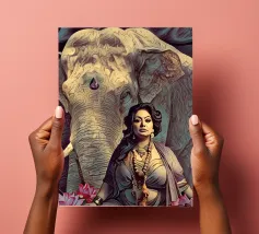 Una donna vestita in modo elaborato è raffigurata davanti a un elefante, circondato da fiori di loto rosa. La scena trasmette un senso di serenità e di connessione con la natura, enfatizzando gli elementi culturali e spirituali. Una donna regale adornata di gioielli siede con grazia davanti a un maestoso elefante, circondato da fiori di loto sbocciati. La scena emana un senso di tranquillità e potere, riflettendo il rapporto armonioso tra uomo e natura. Isha, una forza primordiale - ferma, ma incrollabile. Non forte, ma potente nella sua presenza. La forza risiede nel suo sguardo. Selvaggia, saggia e bella.
