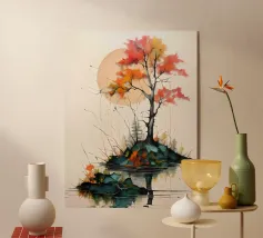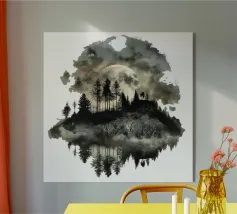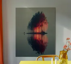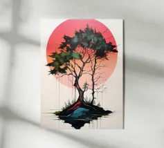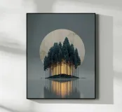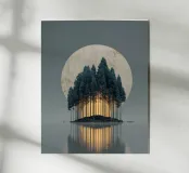 Una composizione serena e minimalista in cui natura e geometria si incontrano in perfetto equilibrio. Un tranquillo boschetto di alberi si erge da una superficie specchiata, incorniciato da una forma circolare luminosa che sembra in parte luna e in parte portale. La simmetria e la palette sobria creano un senso di calma sospensione, come se la scena esistesse al di fuori del tempo.