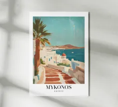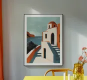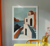 Una scena serena che ritrae una tipica casa di un'isola greca, con la sua caratteristica cupola rossa e le pareti bianche e luminose. L'architettura si immerge nel tranquillo mare verde-azzurro, con una barca a vela all'orizzonte. Le scale che conducono alla porta sottolineano la semplice eleganza e l'atmosfera rilassata di quest'isola mediterranea. Perfetta per uno spazio che trasmette calma e bellezza ispirandosi ai paesaggi costieri.