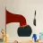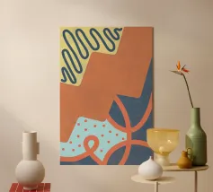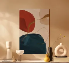 Vivace opera d'arte astratta minimalista. Il contrasto tra il rosso acceso e il verde scuro crea un'intrigante dinamica visiva. L'aggiunta delle tre forme arancioni luminose vicino al centro aggiunge un punto focale e migliora la composizione complessiva. Questa opera d'arte minimalista combina semplicità e complessità.