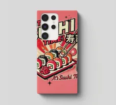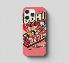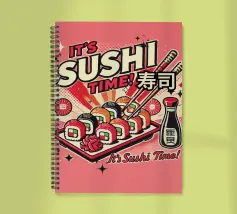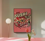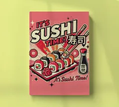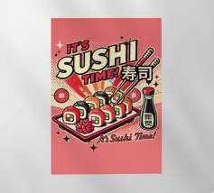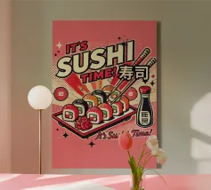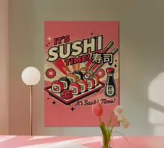 Un testo vivace esclama "È l'ora del sushi!" sopra un piatto colorato di involtini di sushi, arricchito da bacchette e da una bottiglia di salsa di soia. La grafica in stile retrò esalta l'atmosfera giocosa ed eccitante con caratteri giapponesi incorporati.