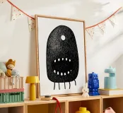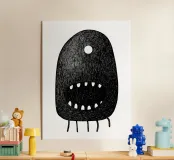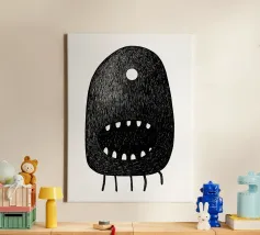Vi presentiamo Ivan, una curiosa creatura nera con un corpo ovale e bizzarro, ricoperto da un disegno a righe. Un unico occhio spalancato fa capolino sulla sommità della testa, mentre una grande bocca aperta rivela una fila ordinata di denti arrotondati. Quattro zampe traballanti aggiungono un tocco di simpatica goffaggine, conferendo a questa piccola stranezza un fascino da mostro più giocoso che spaventoso!