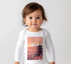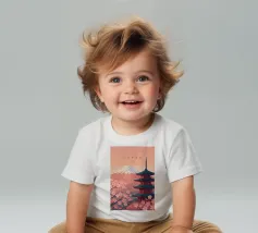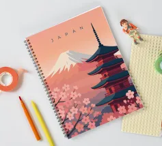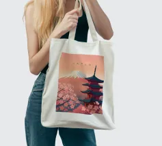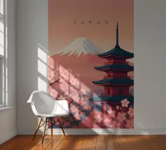Design minimalista giapponese con il famoso vulcano Fuji innevato e un tempio durante la fioritura dei ciliegi in primo piano. Paesaggio tipico giapponese e montagna imponente.