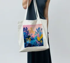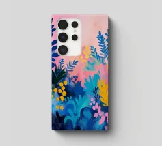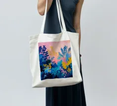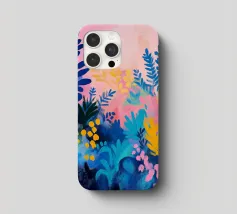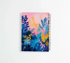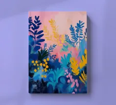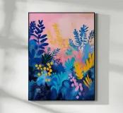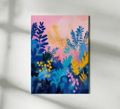 Un quadro astratto pieno di vita, con foglie e fiori nei toni del blu, del rosa e del giallo. Un modo ideale per ravvivare uno spazio e aggiungere un tocco artistico contemporaneo al vostro arredamento.