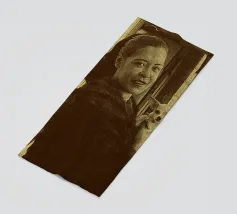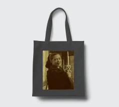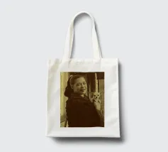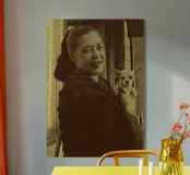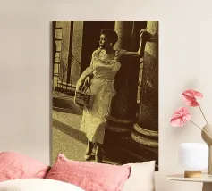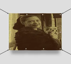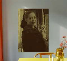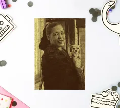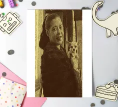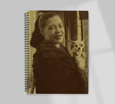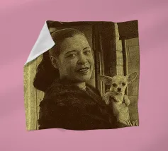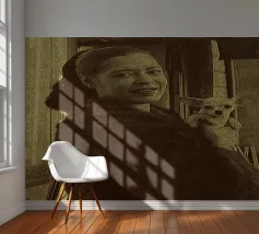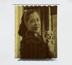 Candida e gioiosa, Billie Holiday tiene in braccio un cagnolino, rivelando la sua calda umanità fuori dal palco. Billie Holiday, sorridente, animale domestico, foto d'epoca, momento fuori dal palcoscenico, cantante jazz, fiore tra i capelli, acquerello candido, gioia retrò, donna piena d'anima, giocosa, icona del jazz, stile classico, grazia femminile, momento vintage, toni morbidi, giornata da signora rilassata, fascino anni '40, calore emotivo, figura storica