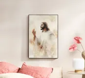 È raffigurato un uomo sereno con la barba e i capelli lunghi, vestito con fluenti abiti bianchi, con un'espressione di pace mentre alza leggermente una mano.
