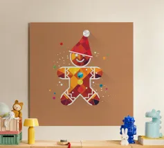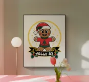 Un festoso personaggio di pan di zenzero, vestito con un cappello da Babbo Natale e un maglione rosso, diffonde l'allegria delle feste con un ampio sorriso. Circondato da stelle, foglie di agrifoglio e dalla scritta "Jolly AF", il disegno irradia un giocoso spirito natalizio.