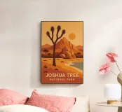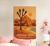 Tramonti infuocati, rocce rosse e le indimenticabili sagome degli alberi di Joshua. Questo poster riassume l'essenza cruda e mistica del deserto californiano. Uno stile forte, sia grafico che contemplativo
