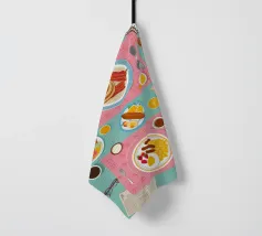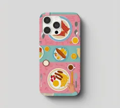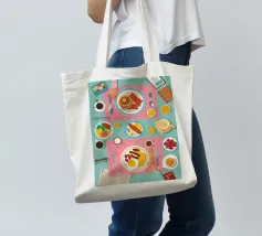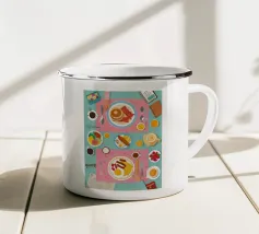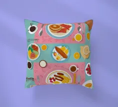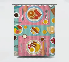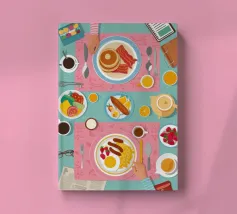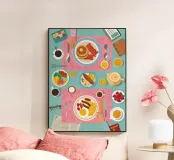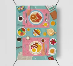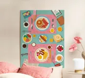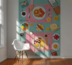 Una gioiosa scena di colazione è ripresa dall'alto e mostra una variopinta selezione di cibi, tra cui uova, toast e caffè, disposti con cura su un tavolo color verde acqua.