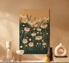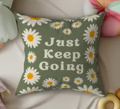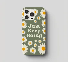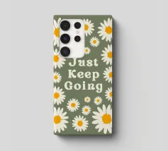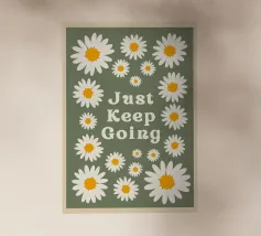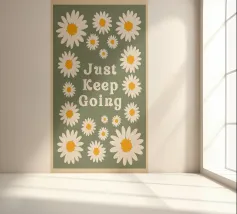 Stampa artistica motivazionale edificante e retrò con la frase "Just Keep Going" circondata da incantevoli margherite bianche e gialle. Lo sfondo verde salvia scuro e la texture rovinata le conferiscono un'estetica vintage anni '70. Perfetta per un dormitorio, un ufficio o una camera da letto. Arte floreale retrò, Just Keep Going, poster estetico anni '70, arte da parete con margherite, stampa motivazionale groovy, deco verde salvia, atmosfera hippie vintage, citazione ispirata