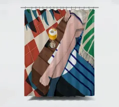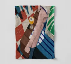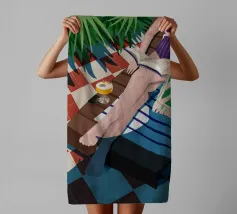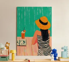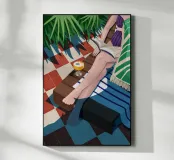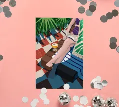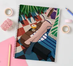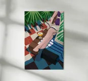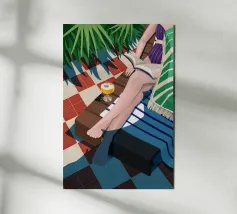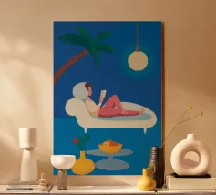 Una splendida illustrazione estiva di una donna in costume da bagno, che legge un libro e si gode un cocktail sdraiata su una sedia a sdraio a bordo piscina. Piante tropicali e piastrelle di terracotta completano l'immagine.