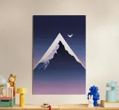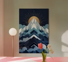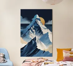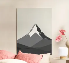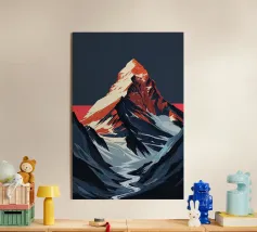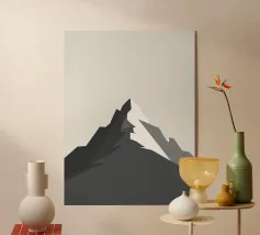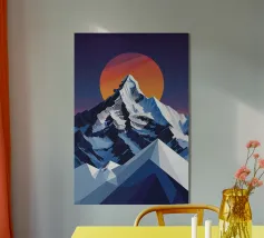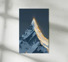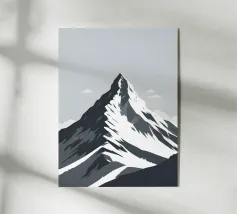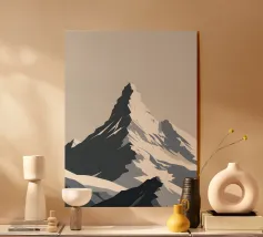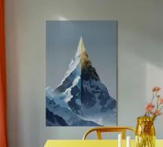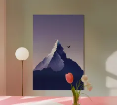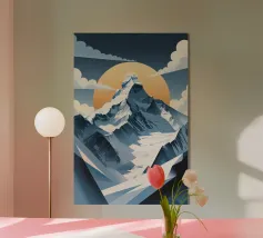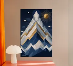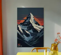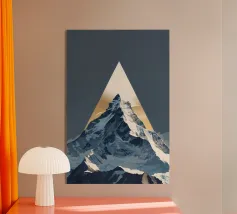 Una rappresentazione artistica del K2 racchiusa in un triangolo geometrico, che simboleggia la struttura imponente e la simmetria della montagna. La combinazione di colori pastello chiari e ombre profonde crea un'atmosfera di calma e meraviglia. L'uccello che vola vicino al triangolo accentua il tema della libertà e dell'esplorazione. Quest'opera d'arte bilancia semplicità e profondità, offrendo un viaggio visivo in una delle più grandi meraviglie della natura, racchiusa in un design moderno.