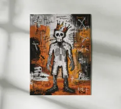 L'immagine raffigura un personaggio in stile KAWS in piedi su uno sfondo di graffiti. Il personaggio ha una testa a forma di teschio con delle "X" al posto degli occhi e indossa una maglietta scura con la scritta "KAWS" in giallo. Lo sfondo è pieno di vari elementi di graffiti, tra cui segni di dollari, corone e frammenti di testo come "LOVE", "FASHION" e "STREET ART".