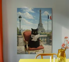 "Un audace gatto parigino cammina con grazia lungo uno stretto cornicione, in alto sopra le vivaci strade di Parigi. Con la Torre Eiffel sullo sfondo, questa scena surreale mescola umorismo e poesia mentre il felino cammina con sicurezza, come se il pericolo semplicemente non esistesse. In questo collage, lo spirito avventuroso del gatto si fonde con l'essenza romantica della Ville Lumière, creando un'immagine che delizia sia gli amanti dei gatti che gli incantati da Parigi".