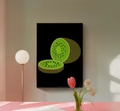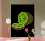 La rappresentazione vivace e stilizzata di un kiwi presenta un interno verde brillante con semi neri. Il disegno enfatizza il contrasto tra il colore verde brillante del kiwi e i suoi semi scuri.