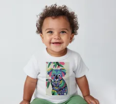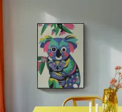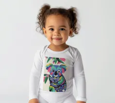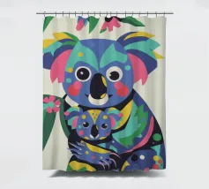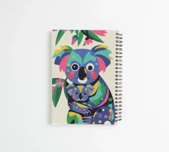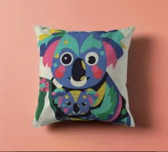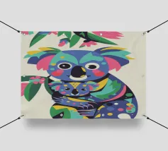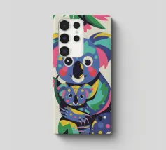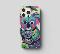 Una madre koala che tiene in braccio un cucciolo di koala, entrambi raffigurati in uno stile colorato e astratto. Lo sfondo è caratterizzato da foglie e rami stilizzati.