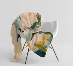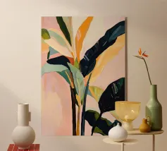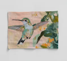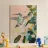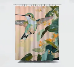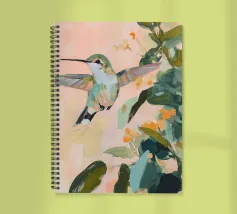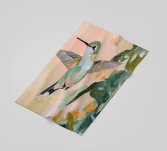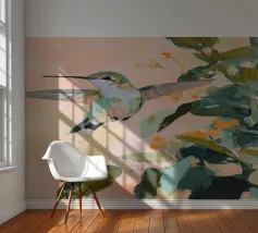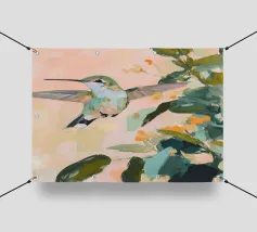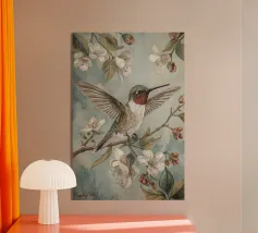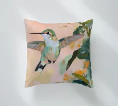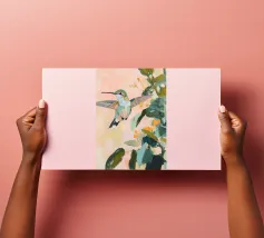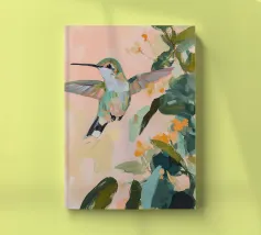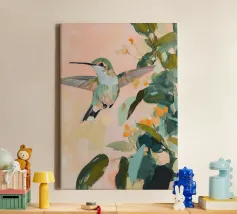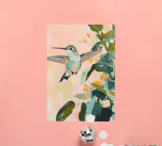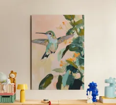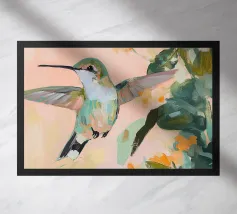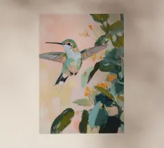 Un dipinto a olio di un colibrì, minimalista con colori pastello, piante e fiori verdi sullo sfondo, cielo rosa e atmosfera primaverile. Il dipinto presenta pennellate visibili e uno stile astratto e neutro.