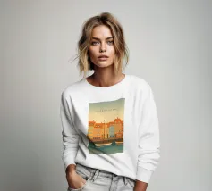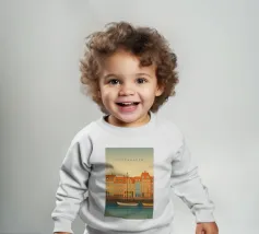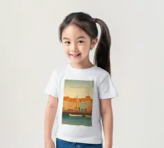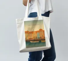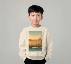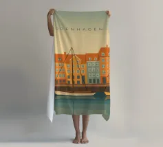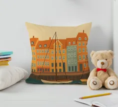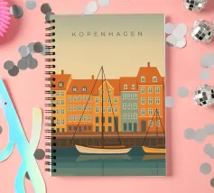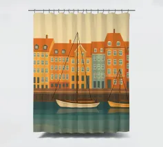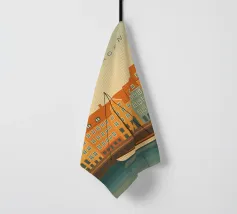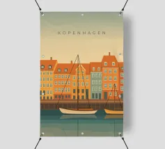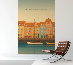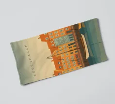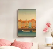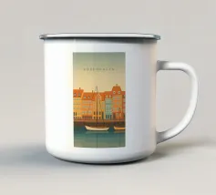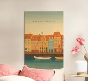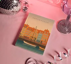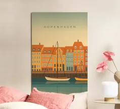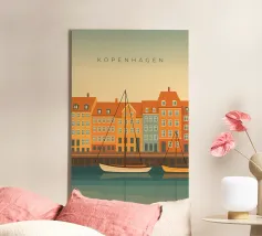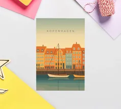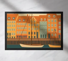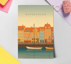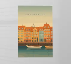 Minimalist travel motif or Denmark design featuring pretty houses and two sailing boats in Nyhavn in Copenhagen. Ideal for anyone who loves Scandinavian cities and enjoys city breaks.