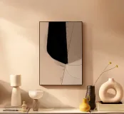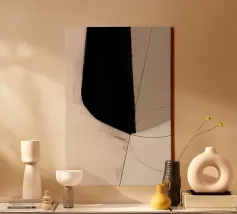 Una meditazione sulla profondità e sulla luce, "Kuro" utilizza un gesto audace e ampio di nero vellutato per ritagliare uno spazio all'interno della tela. Questo elemento, forte e deciso, è ammorbidito da una tavolozza eterea di blush e beige, che crea un'atmosfera di tranquilla raffinatezza. L'opera attira l'attenzione con i suoi blocchi di colore drammatici, ma invita all'introspezione attraverso le linee deboli e tracciate che alludono a una piega invisibile, a un confine o a una geometria soppressa sotto la superficie.