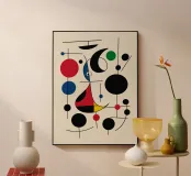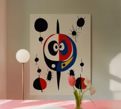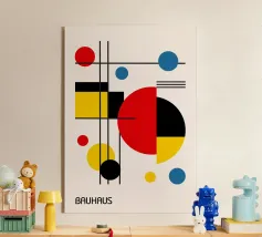 Una composizione astratta caratterizzata da forme geometriche audaci e colori primari, come il rosso, il blu, il verde e il giallo. La composizione comprende cerchi, linee e curve che creano un senso di movimento ed equilibrio.