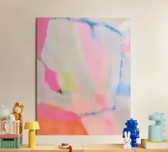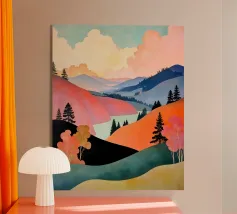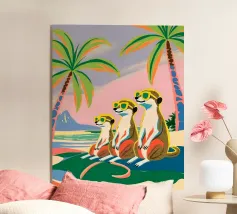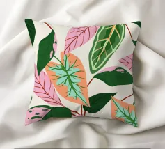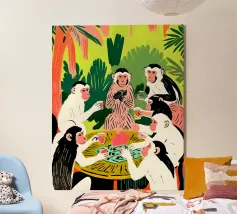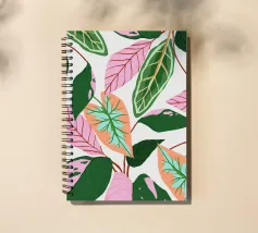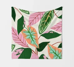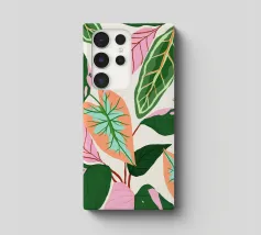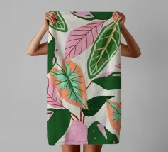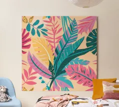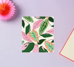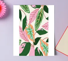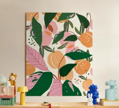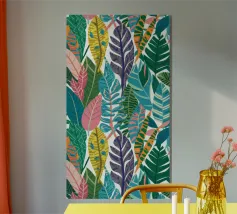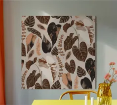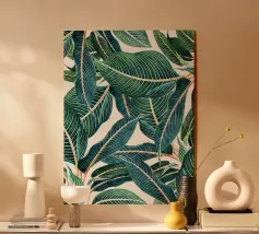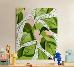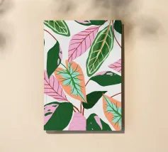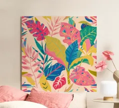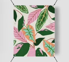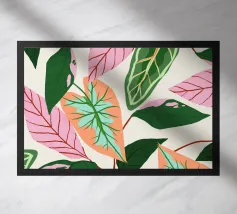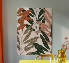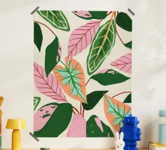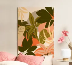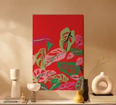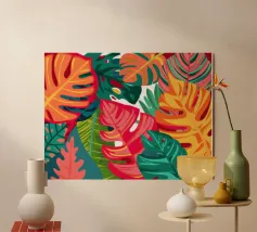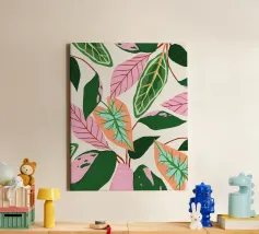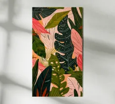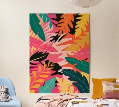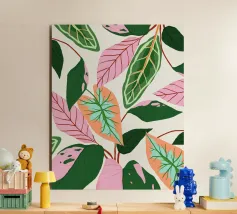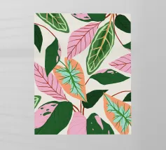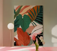 Questa vibrante opera d'arte presenta una composizione dinamica di foglie tropicali in colori audaci e contrastanti. L'opera presenta un mix di fogliame verde intenso, rosa tenue e arancione brillante, con intricati motivi di venature che aggiungono consistenza e dettagli. Il gioco di toni caldi e freddi crea un'atmosfera vivace ed energica, mentre lo sfondo pulito color crema permette alle foglie di risaltare in modo evidente. L'approccio grafico e stilizzato conferisce all'opera un'estetica moderna e giocosa, evocando la bellezza lussureggiante della natura in un design contemporaneo.