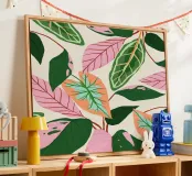 Questa vibrante opera d'arte presenta una composizione dinamica di foglie tropicali in colori audaci e contrastanti. L'opera presenta un mix di fogliame verde intenso, rosa tenue e arancione brillante, con intricati motivi di venature che aggiungono consistenza e dettagli. Il gioco di toni caldi e freddi crea un'atmosfera vivace ed energica, mentre lo sfondo pulito color crema permette alle foglie di risaltare in modo evidente. L'approccio grafico e stilizzato conferisce all'opera un'estetica moderna e giocosa, evocando la bellezza lussureggiante della natura in un design contemporaneo.