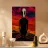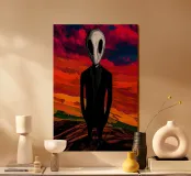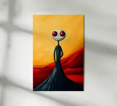 Una figura misteriosa in un abito nero immacolato si trova al centro di un paesaggio irreale e dai colori intensi. Il cielo si illumina di toni rossi profondi, mentre il terreno si estende in tonalità infuocate. Il suo volto è simile a una maschera, quasi ultraterreno, vuoto eppure penetrante con i suoi profondi occhi neri e inespressivi. L'immagine emana un'atmosfera opprimente, simbolo di isolamento, di segreti o di una presenza che sembra esistere al di fuori della realtà.