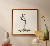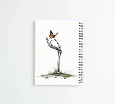 Una mano scheletrica solitaria si protende dalla terra, non per afferrare, ma per sollevare. Sulla punta delle sue dita riposa una farfalla monarca, viva e radiosa. Qui la morte non è la fine, ma un punto d'appoggio. Questo è un sussurro di resurrezione, un silenzioso lasciar andare.