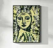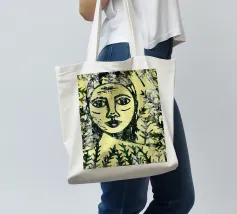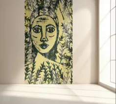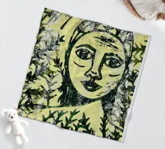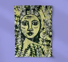 Printed on a sterile compress, this feminine print seems to float on the top of a mountain. The woven print gives it a living, almost organic texture. Around her, green points evoke fir trees, a breath of nature. Between strength and gentleness, this work unites the body and the landscape. Let yourself be carried away by its serenity and invite a fragment of poetic nature into your home.