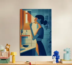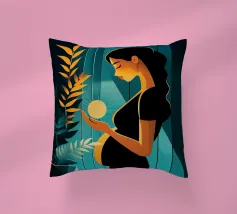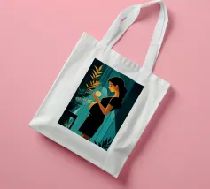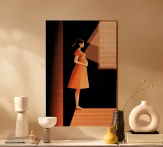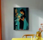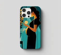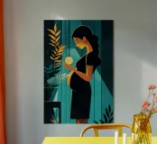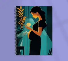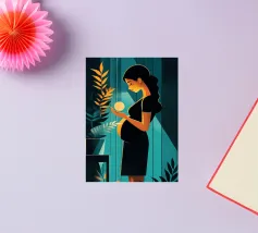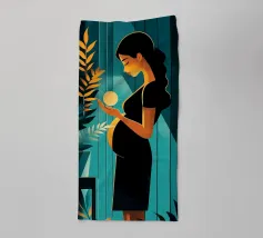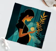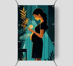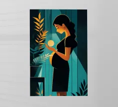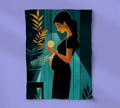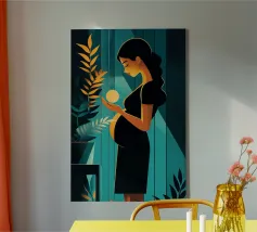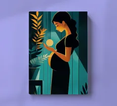 Un'illustrazione potente e serena che cattura il miracolo della nuova vita. In una stanza tranquilla, una madre in attesa tiene in mano una sfera luminosa, che simboleggia l'energia radiosa e la speranza che cresce dentro di lei. Il contrasto drammatico tra la luce calda e i toni freddi e scuri rende questa opera d'arte moderna e profondamente commovente.