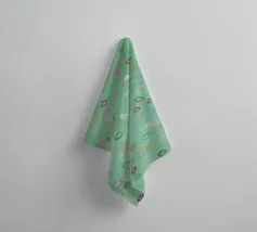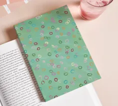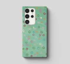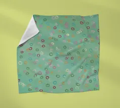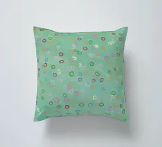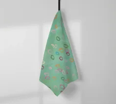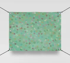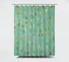 Questa immagine presenta un motivo astratto con un morbido sfondo verde mare. Sulla superficie sono disseminate numerose forme ovali irregolari in vari colori pastello, tra cui tonalità di rosa, arancione, giallo, verde e viola. Gli ovali sembrano dipinti a mano con pennellate visibili che danno consistenza alle forme. L'effetto complessivo è giocoso e stravagante, e ricorda le bolle che galleggiano dolcemente in un tranquillo ambiente acquatico o i coriandoli colorati sospesi a mezz'aria. Nell'angolo in basso a sinistra è presente una firma che indica il marchio dell'artista.
