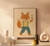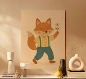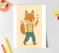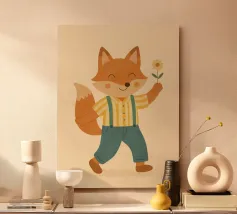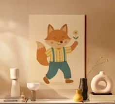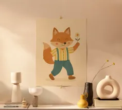Aggiungete un tocco morbido e caldo al vostro arredamento con questo poster che raffigura una simpatica volpe vestita con una tuta blu che tiene in mano un fiore. Perfetta per una decorazione murale di ispirazione scandinava, questa illustrazione colorata e moderna si adatterà perfettamente alla camera del bambino, alla stanza dei giochi o alla cameretta di un ragazzo.