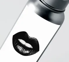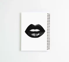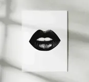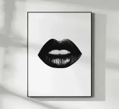 Un poster minimalista in bianco e nero con una bocca da baciare e labbra nere incarna l'eleganza e lo stile del mondo della moda, ispirato a Vogue.