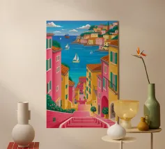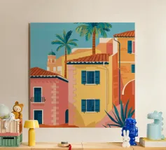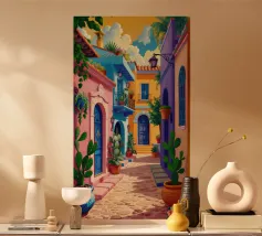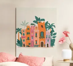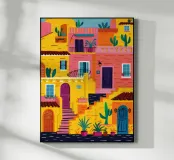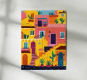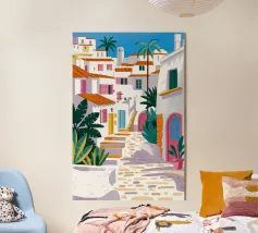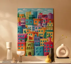 Un'illustrazione vibrante e dettagliata di una città collinare simile a un labirinto, con case colorate, scale e piante ovunque. La scena è una rappresentazione gioiosa, energica e complessa di una vivace comunità mediterranea.
