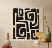 Quest'opera attira lo sguardo in una danza ipnotica di forme nere! Linee spesse e curve e spirali si fondono in un labirinto dinamico su uno sfondo color crema: un gioco di positivo e negativo, movimento e calma. Lo stile è un puro minimalismo organico con pennellate espressive, influenzato dalle silhouette di Matisse e dalla potenza grafica della modernità di metà secolo. Il dipinto crea una profondità meditativa, suscita curiosità ed equilibrio interiore, permettendo allo spettatore di sprofondare nella contemplazione. Per ambienti che richiedono elegante raffinatezza e chiarezza spirituale.