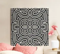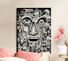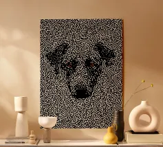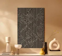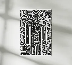 Un volto fatto di linee: Quest'opera trasforma un ritratto in un labirinto grafico. I contorni bianchi su sfondo nero ricordano la Op Art, la tipografia Bauhaus e l'arte vettoriale digitale. L'opera gioca con la percezione e l'identità - ridotta, ritmica, enigmatica. Un'immagine che non solo si guarda, ma che vuole essere decifrata. Un richiamo ideale per ambienti luminosi e minimalisti, progettati per coniugare intelletto ed estetica.