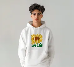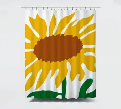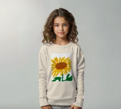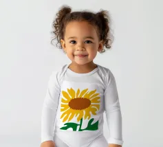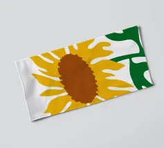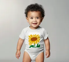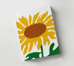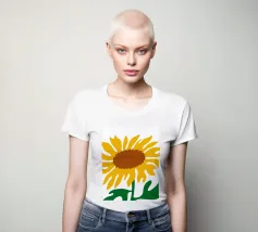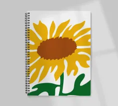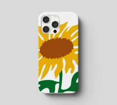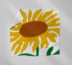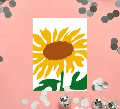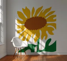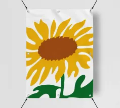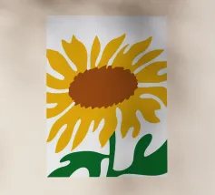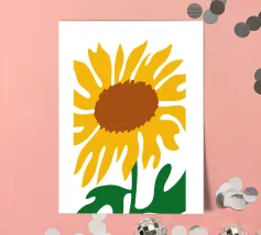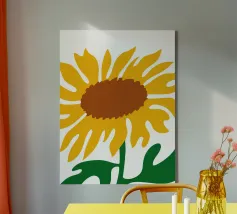 Una raffigurazione semplicistica presenta un grande girasole con petali di un giallo vivace e un centro marrone. Le foglie verdi si estendono dalla base, aggiungendo contrasto ai toni caldi del fiore.