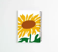A simplistic depiction features a large sunflower with vibrant yellow petals and a brown center. Green leaves extend from the base, adding contrast to the warm tones of the flower.