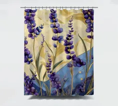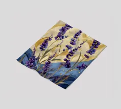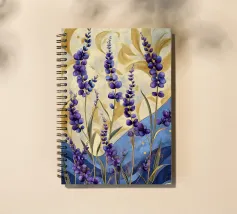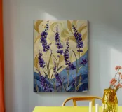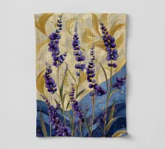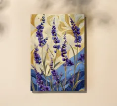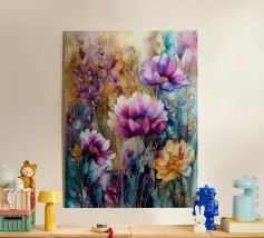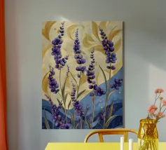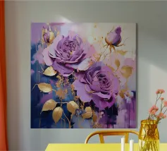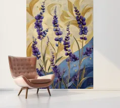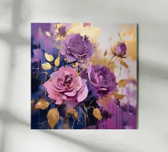 L'immagine mostra fiori viola brillanti in uno stile artistico decorativo e stilizzato. I fiori sono sapientemente disposti e circondati da motivi curvilinei in oro e blu, creando un'atmosfera elegante e dinamica. Lo stile è al tempo stesso giocoso e sofisticato, con colori audaci e forme armoniose. Un'affascinante interazione tra natura e ornamento!