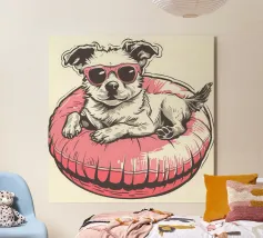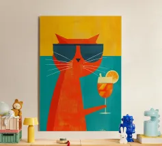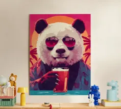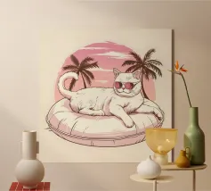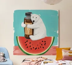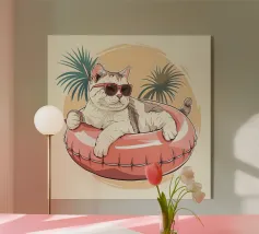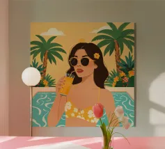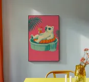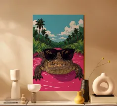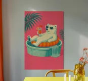 Un'illustrazione stravagante e vivace di un orso polare che vive la sua vita migliore: occhiali da sole, cocktail nella zampa e galleggiante in una piscina per bambini con una mini cascata. Su uno sfondo tropicale rosa caldo, quest'opera d'arte dona un tocco di umorismo e vibrazioni rilassanti a qualsiasi spazio. Perfetto per gli amanti dell'arte eccentrica, dell'estetica retrò e dell'atteggiamento rilassato. Che sia per il salotto, l'ufficio o la casa estiva, questo pezzo garantisce sorrisi.