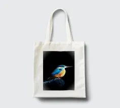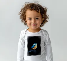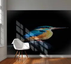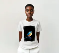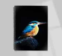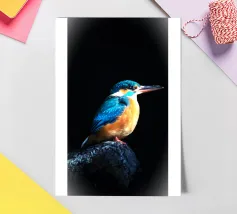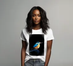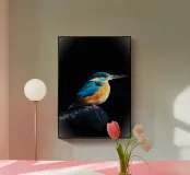 Il martin pescatore si trovava su una roccia che sporgeva nell'acqua, con un'aria solenne. Le sue piume blu scintillavano alla luce, le sue ali erano ben chiuse. La testa era leggermente sollevata, il lungo becco rivolto verso la luce come se fosse perso nei suoi pensieri. I suoi occhi erano acuti ma profondi, come se stesse contemplando l'acqua che scorre. Lo spazio circostante era silenzioso, evocando un senso di pace e contemplazione.